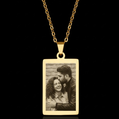 A rectangular gold-finish pendant featuring a detailed laser-engraved photograph, turning your most cherished memories into a wearable piece of art.